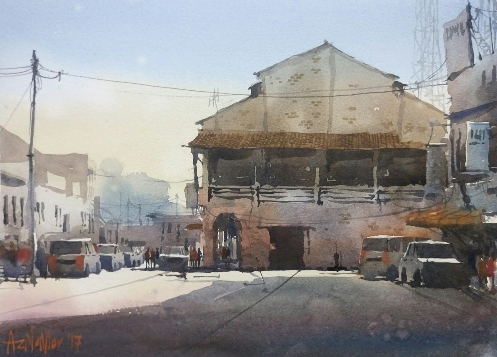 Kebiasaannya aktiviti plein air berlangsung antara jam 8-10 pagi, dan bagi saya untuk tidak melengahkan masa saya akan keluar rumah seawal selepas Subuh bagi memastikan saya sampai tepat pada masanya atau lebih awal. Jadi sepanjang perjalanan awal pagi saya akan dapat pemandangan bonus yang jarang di'capture' oleh pelukis. Pemandangan ini saya tukarkan menjadi lukisan... dan inilah hasilnya...